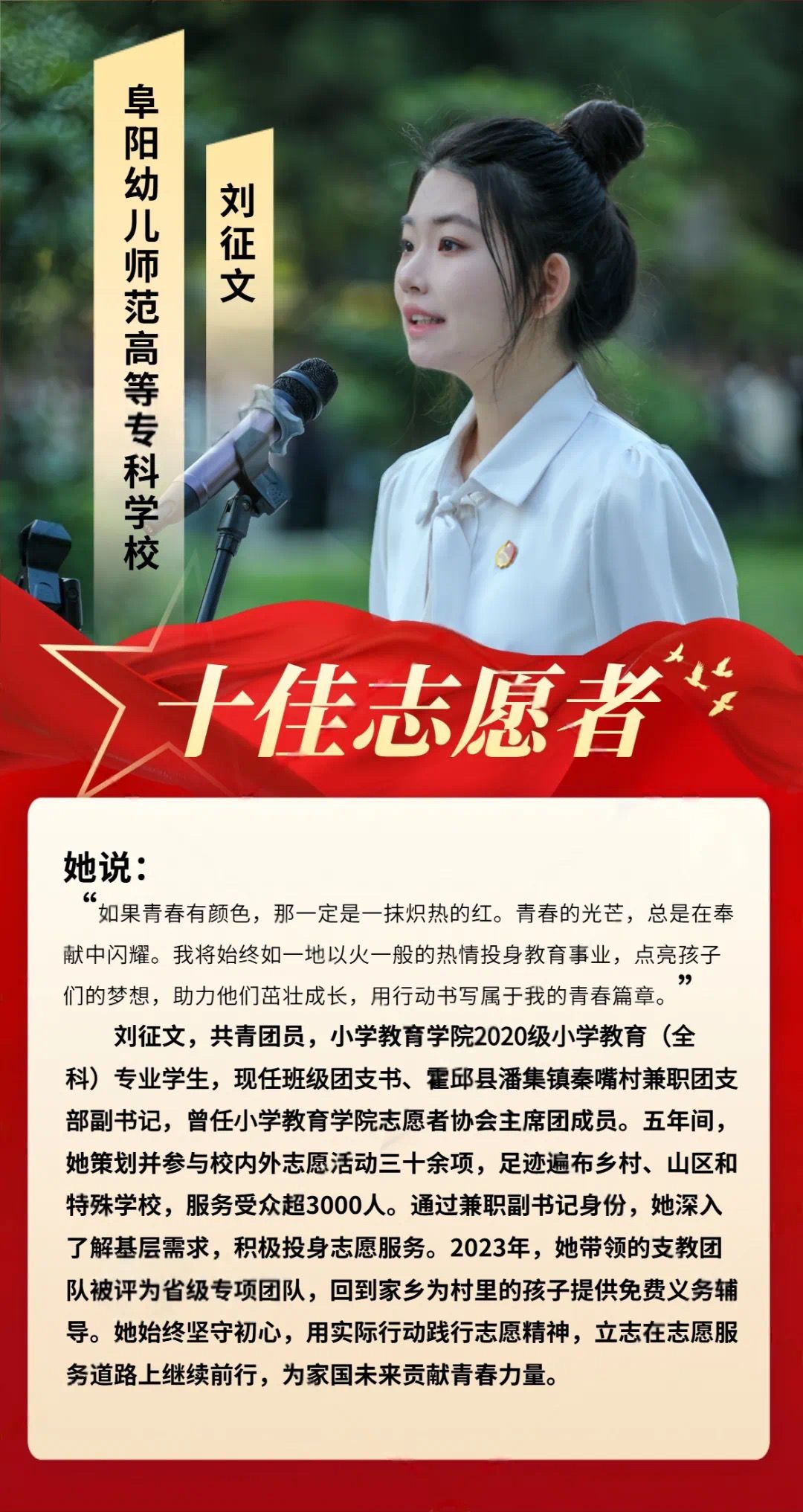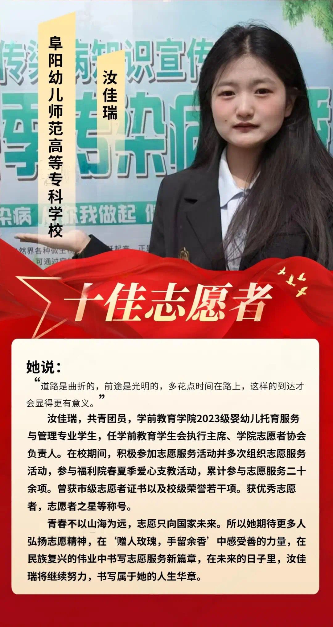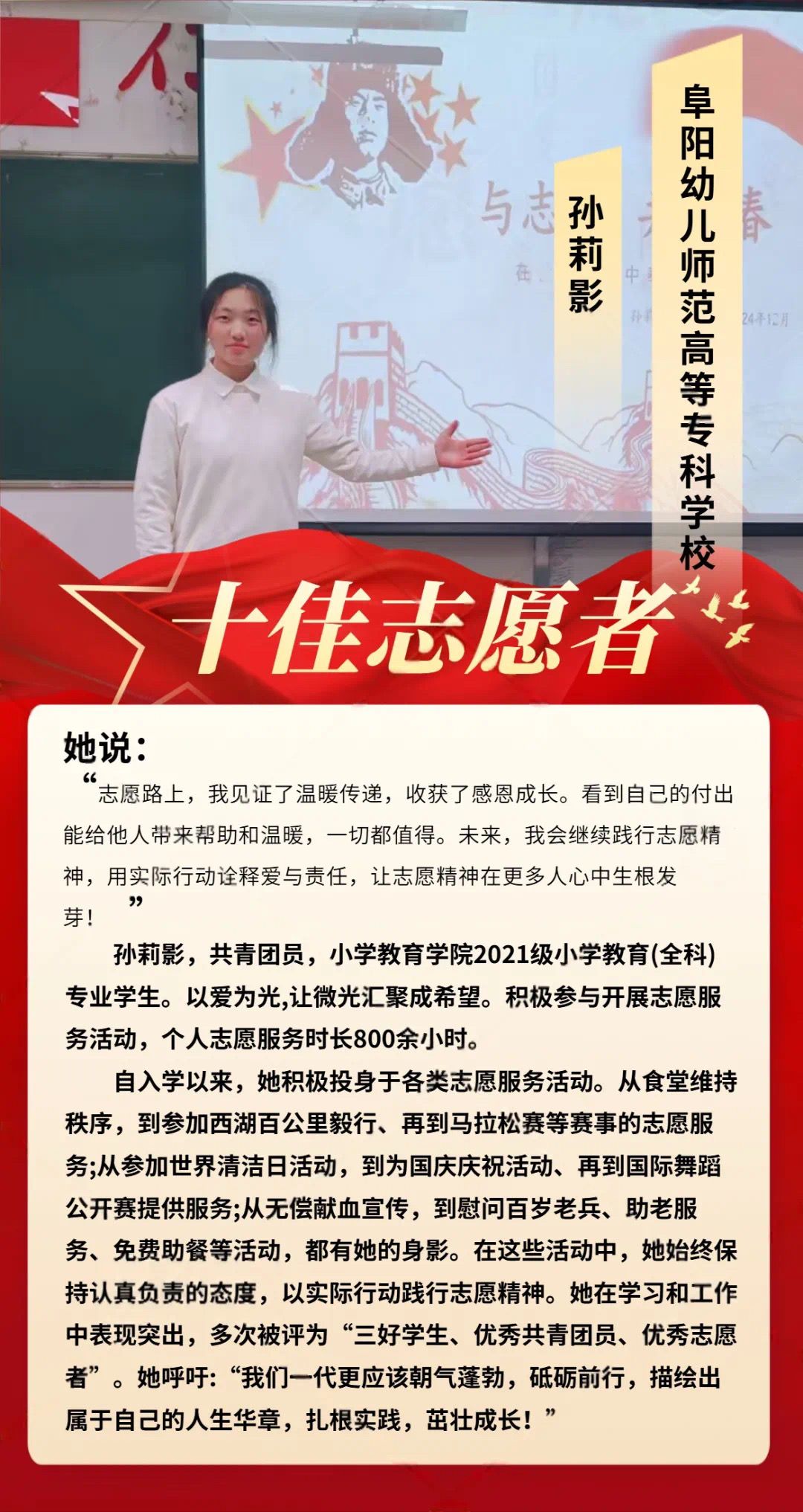 他们是青春热忱的践行者,脚步丈量奉献的温度。从支教课堂到社区服务,从环保守护到急救科普,十佳志愿者以微光点亮校园,用行动定义不凡。