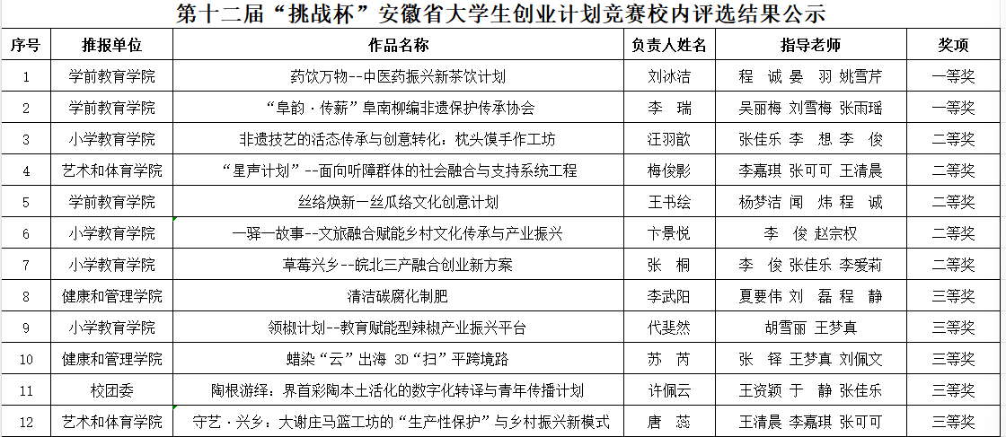 根据《关于开展第十二届“挑战杯”安徽省大学生创业计划竞赛校内选拔赛的通知》相关要求,经个人申报、学院推荐、校级评审,现将我校第十二届“挑战杯”安徽省大学生创业计划竞赛校内评选结果予以公示。