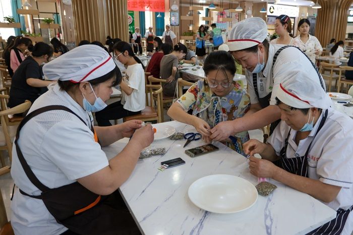 在食堂阿姨的示范下,大家纷纷动手尝试包粽子,形状各异的粽子在同学们的欢声笑语中逐渐完成。