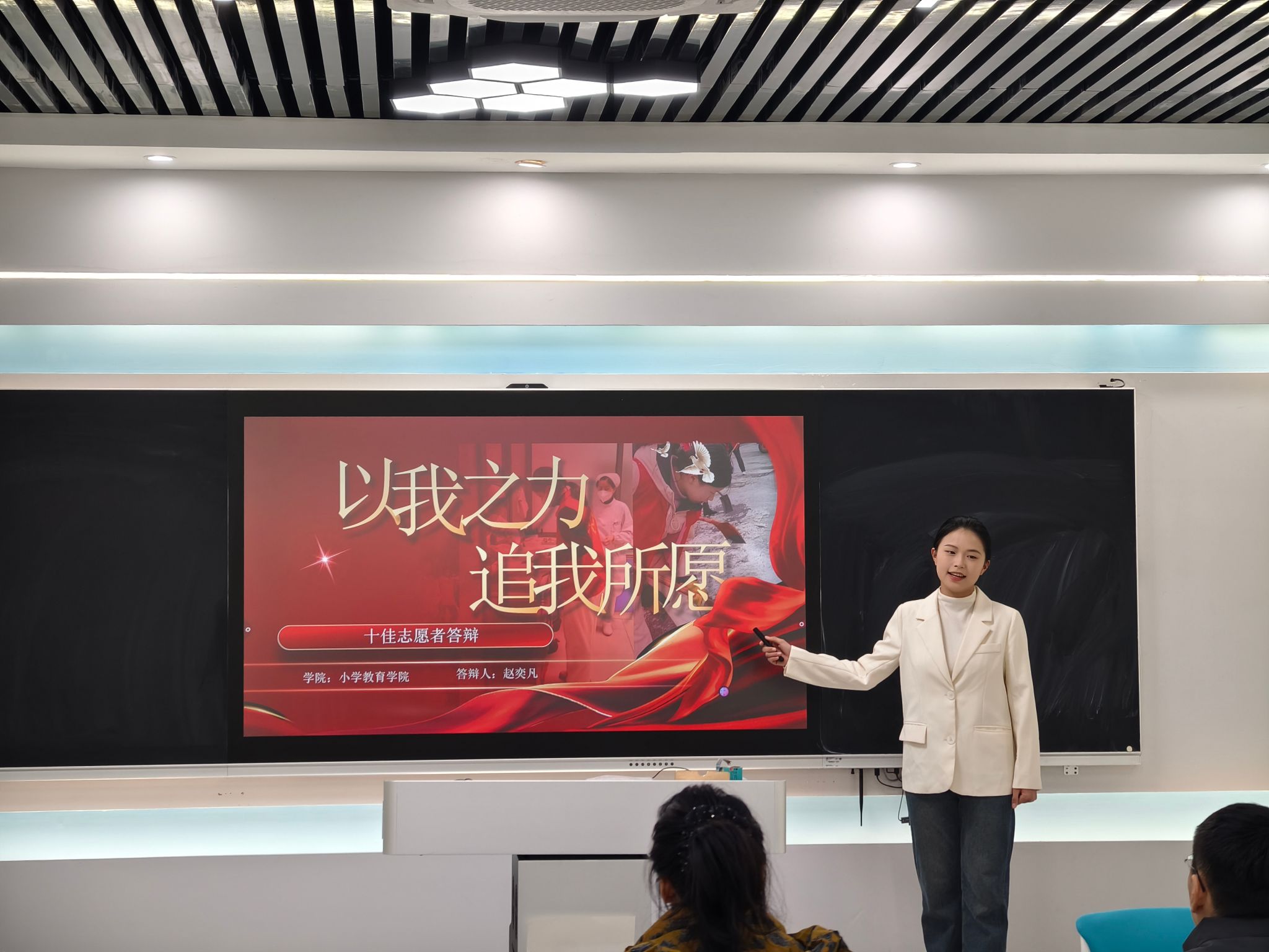经各学院推荐,共有17名同学进入校级终审评选。评审现场,17名候选人从常规项目、重大活动、服务感悟等方面分享自己的志愿经历,充分展现了幼专学子的青春担当。来自小学教育学院小学教育专业的刘征文,她致力于将专业与志愿服务相结合,作为暑期“三下乡”爱心支教团队骨干成员,她多次赴黄山市休宁县、六安市叶集区三元镇为山村留守儿童进行爱心支教,事迹被黄山日报、中国青年网、安徽科技报等多家主流媒体报道;来自健康和管理学院现代教育技术专业的柏礼菲,作为阜阳市青年新媒体工作室的实习生,她多次服务阜阳市春运“暖冬行动”、阜阳市马拉松等重大赛事,在志愿服务中她用镜头捕捉精彩瞬间、记录美好时刻,她剪辑制作的视频多次被阜阳市共青团、阜阳文旅转发;来自学前教育学院学前教育专业的李清荣,作为学校足球队的一员,他发挥特长,每周坚持到乡村小学教授小学生足球课,致力补充乡村小学足球课程,为小朋友点燃体育锻炼的梦想。