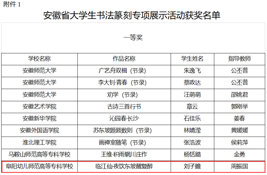 近日,由安徽省教育厅与安徽省文学艺术界联合会主办、安徽省书法家协会与安徽师范大学承办的安徽省大学生书法篆刻展示活动圆满落幕。本次比赛是安徽省大学生科学和技能竞赛B类赛事项目,我校学子在此次展示活动中表现优异,共斩获一等奖1项,二等奖5项,三等奖4项,上报作品全部获奖。
