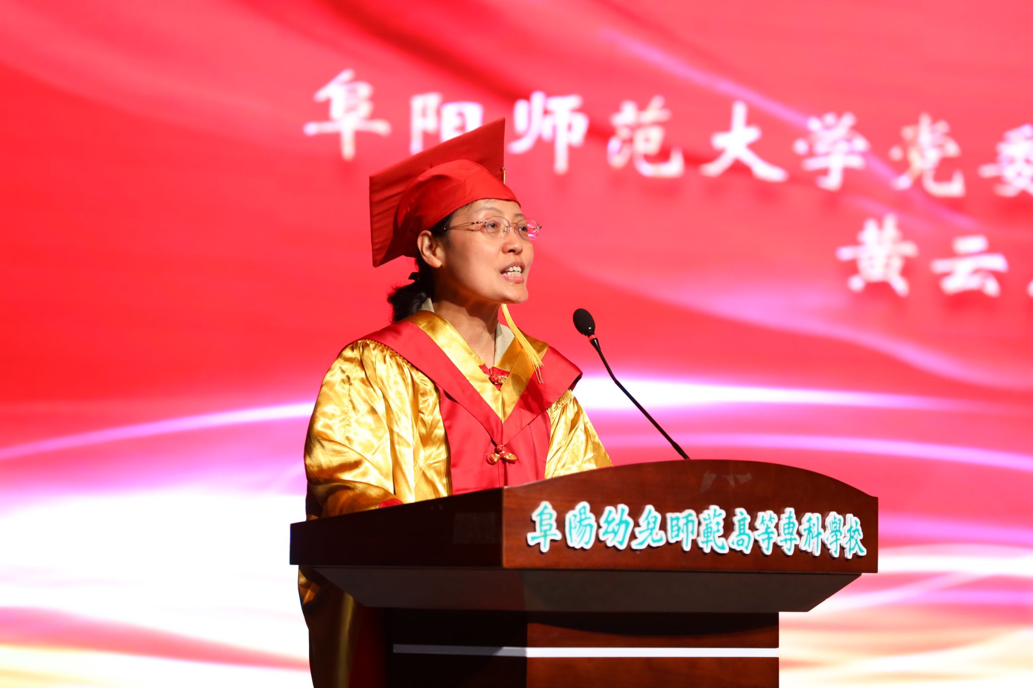 阜阳师范大学党委常委、副校长黄云志代表阜阳师范大学发表了饱含深情的致辞。她指出,联培专升本学子们在学业成绩、技能竞赛、思想进步和就业创业等方面取得的丰硕成果。245名毕业生中,21名同学加入中国共产党,22名同学考取研究生,这既是学子们勤学奋进的硕果,更是两校深化合作、协同育人的成功实践。她勉励毕业学子们,要胸怀家国,以理想之光照亮星河远航,将“小我”融入“大我”,让青春在服务国家、奉献社会的坐标系中璀璨绽放;要立德修身,以明德至善铸就人生丰碑,坚守品格,以“学高为师,身正为范”的精神基因,成就德才兼备的“大写人生”;要勤学笃行,以知行合一振动垂天之翼,永葆求知热忱,以“苟日新,日日新”的自觉,在实践中求真知,在实干中长才干,让创新成为青春远航的不竭动力。