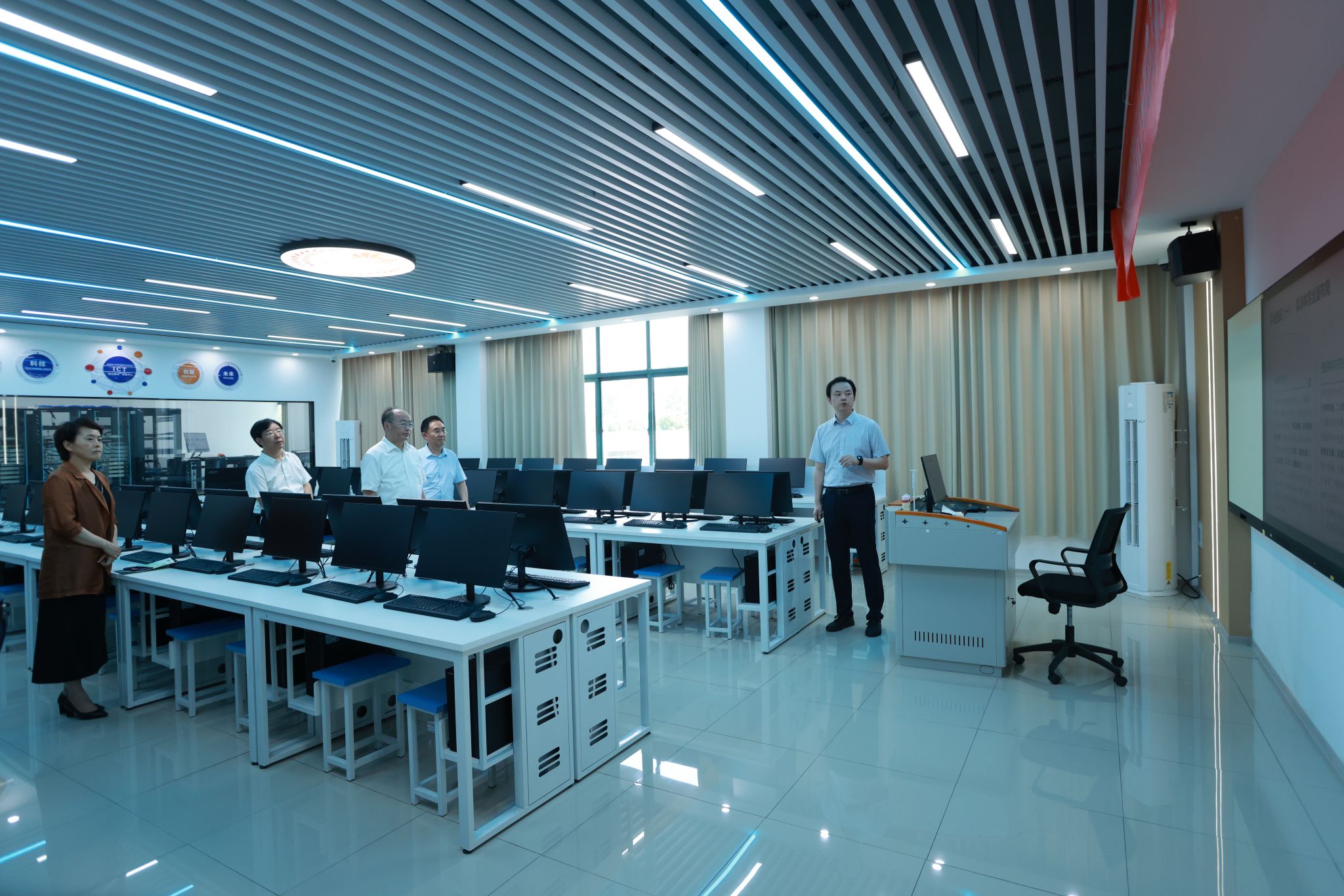 钱桂仑先后实地考察了小学教育学院的智慧教室、科学虚拟仿真实训室、语音技能实训室、网络直播室,健康和管理学院(人工智能和信息学院)的华为产教融合实践中心、大数据应用中心、健康养老实训室,听取我校工作汇报,并就调研问题详细了解情况。