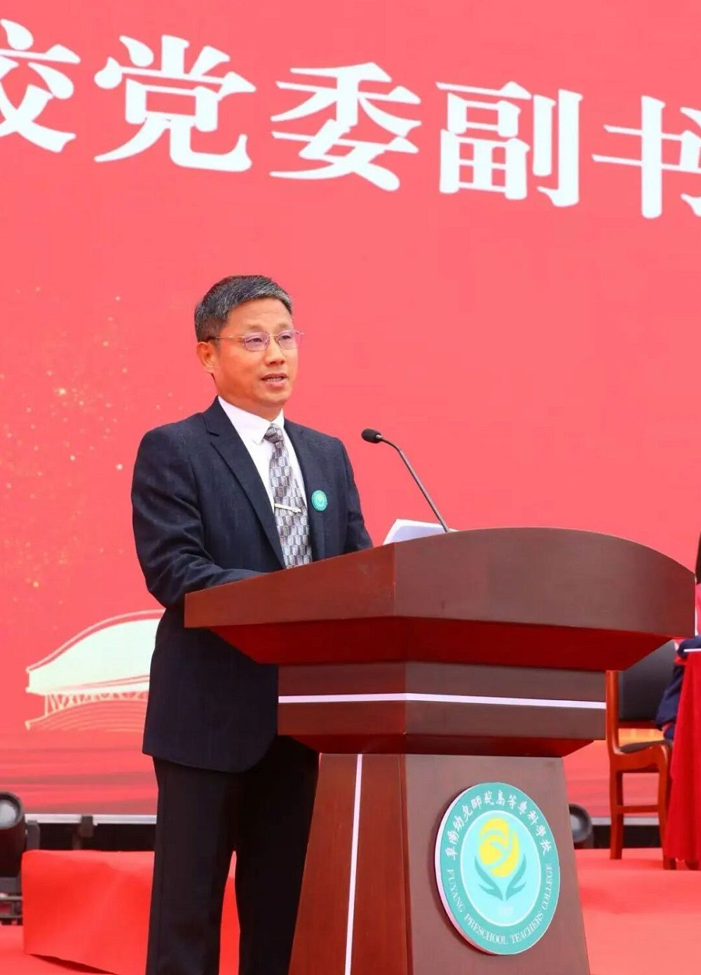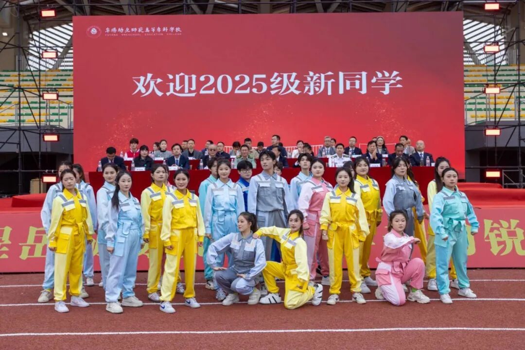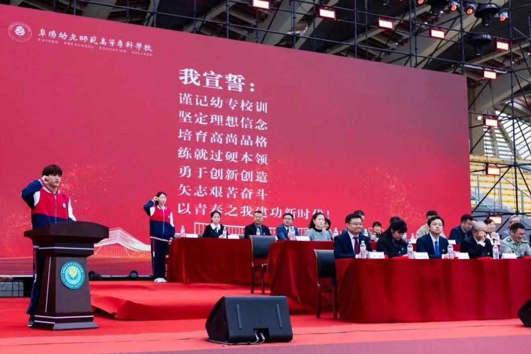 典礼上,校领导们为2025级新生佩戴校徽,台下新生自行佩戴校徽。校徽贴襟之时,标志着新生们从此与阜幼专血脉相连,更意味着新生接过阜幼专的初心和使命,成为真正的“阜幼专人”。