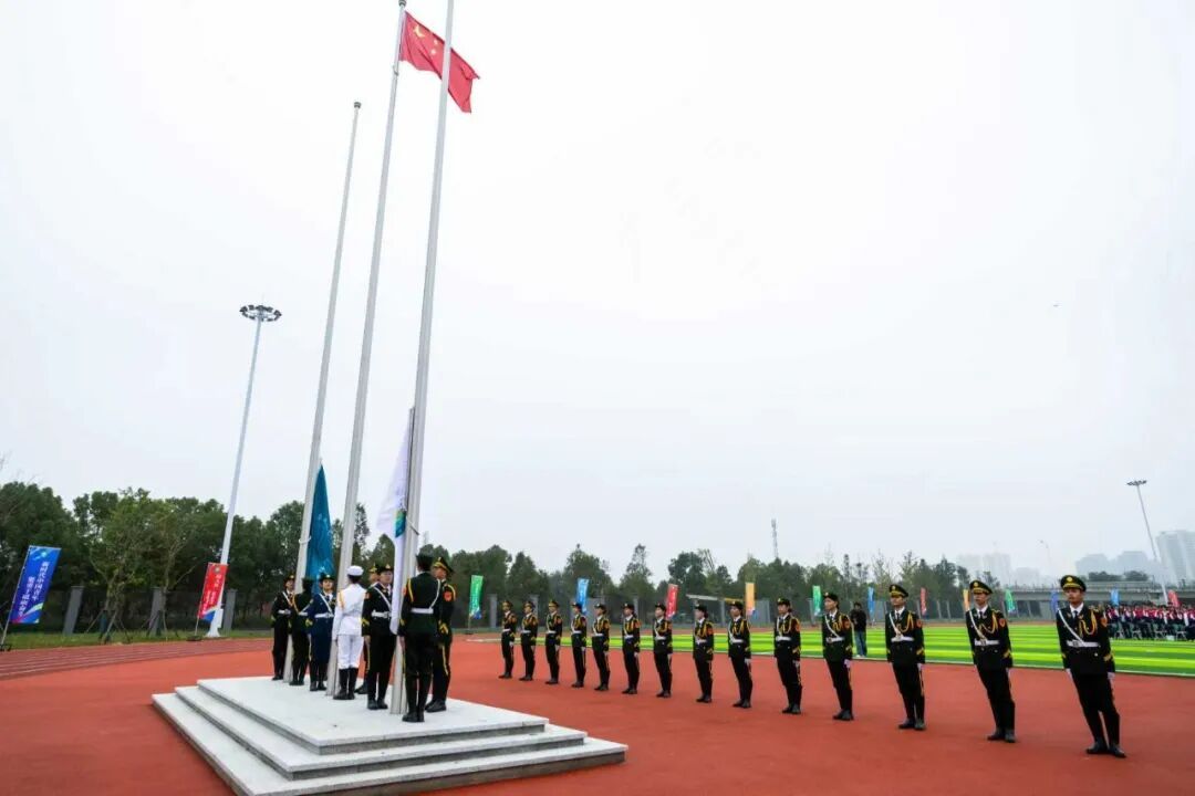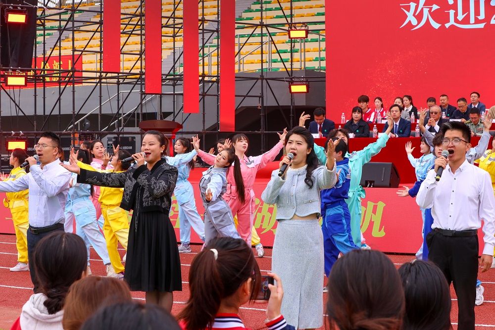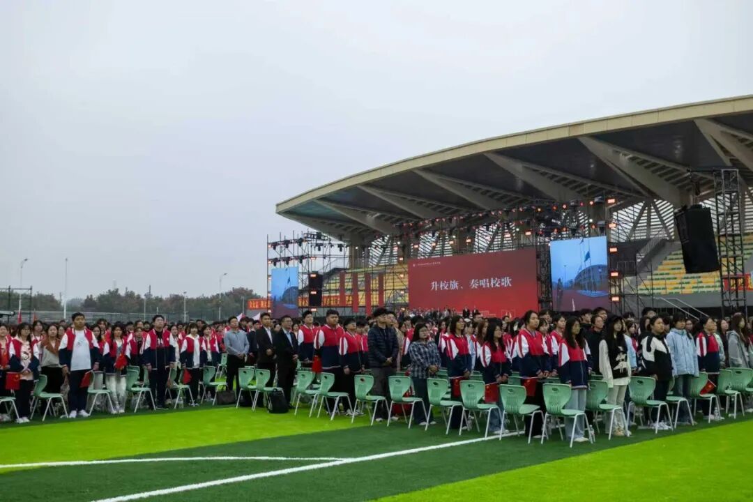 典礼现场全体新生身着校服,整齐列坐。我校大学生艺术团以优美的歌声与舞蹈点燃全场氛围,国旗挥舞,迸发出青春的光彩。