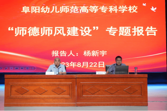 8月22日下午,我校“师德师风建设”专题报告会在演艺大厅举行。阜阳师范大学皖北文化研究中心主任杨新宇教授作专题报告。校党委副书记于华献主持报告会。全体班子成员、全体教职员工聆听了报告。