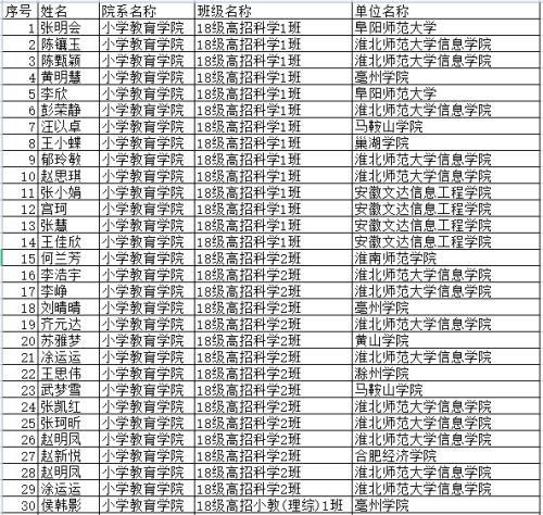 近日,2021年安徽省各高校专升本考试成绩及拟录取名单纷纷出炉,我院学子在今年“专升本”考试中再创佳绩。截至目前,我院报名考试的162名学生中,已有110名学生分别被阜阳师范大学、淮北师范大学、蚌埠学院、淮南师范学院、巢湖学院、滁州学院、黄山学院、亳州学院等高校录取,报录比高达67.9%,较去年的63.2%稳中有升,为学院历年最高,与同类高校相比,亦是名列前茅!同时我院595名小学教育(全科)专业学生,100%带编入职,实现高质量就业。