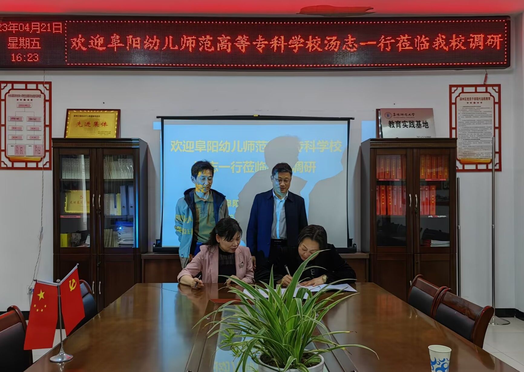 郭玉敏和钱春莉分别代表两校,共同签署了建立实践教学基地的协议书,汤志为刘锜小学授牌。