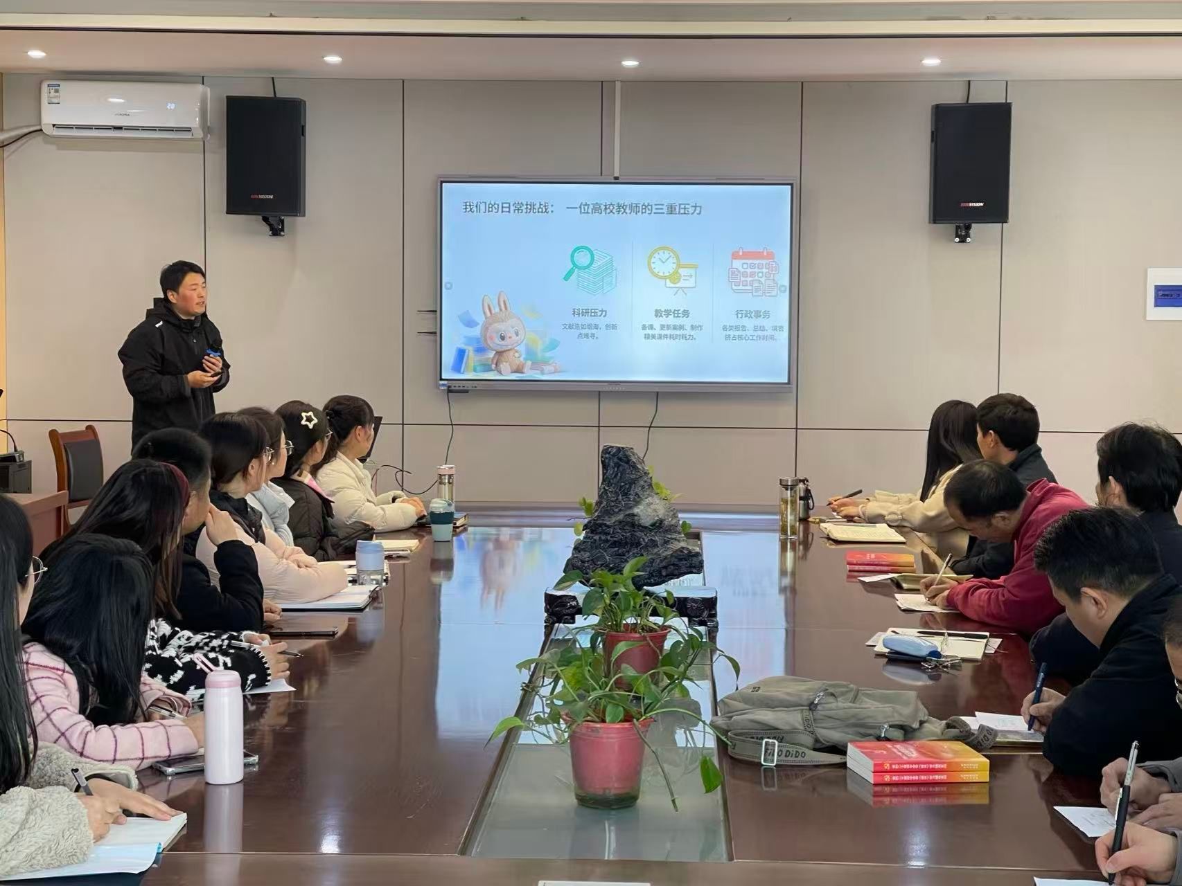 为推进人工智能技术与教育教学工作深度融合,12月10日,我院组织举办了“AI赋能教学:工具应用与课堂创新”经验分享会。本次活动由学院教师蒋佳佳主讲,学院全体教职工参加。
