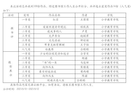 5月20日,我校在图书馆举行了首届读书月活动总结表彰会,我院14份学生作品在全校百余份学生作品中脱颖而出,包揽读书月系列活动全部奖项。同时,因我院党团组织积极响应学校号召,在读书月系列活动中组织得力,我院荣获最佳组织奖。