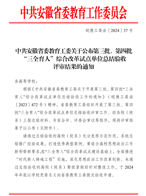 近日,省委教育工委发布《中共安徽省委教育工委关于公布第三批、第四批“三全育人”综合改革试点单位总结验收评审结果的通知》(皖教工委函〔2024〕37号),我院作为安徽省第四批“三全育人”综合改革试点院系,顺利通过验收。
