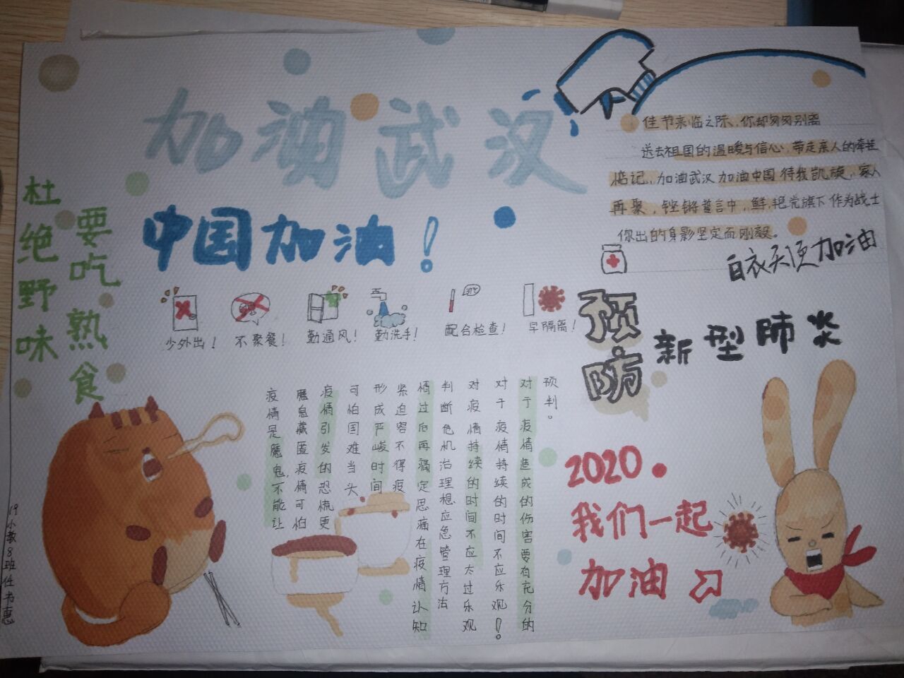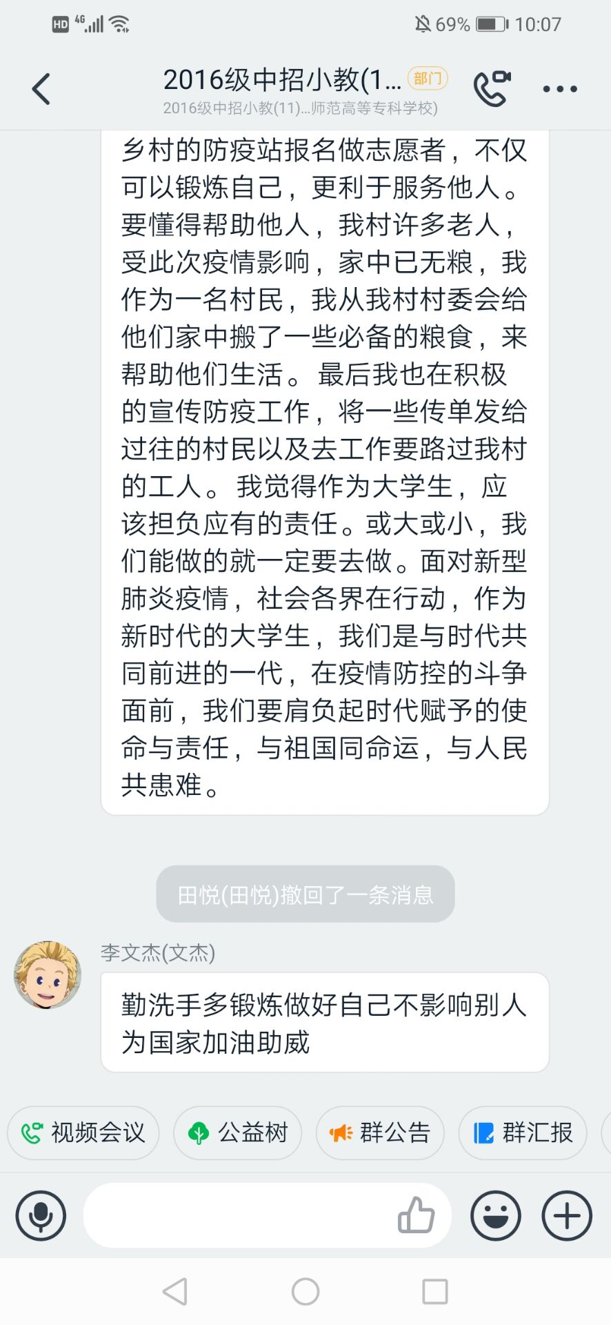 各班主题班会围绕“停课不停学”,要求学生高质量完成老师教学安排、积极关注班级通知,并强调了学校加强疫情防控的工作举措和具体要求。毕业班辅导员围绕“疫情防控、实习就业”主题,重点分析了当前就业形势,积极引导学生通过视频面试、网络签约等招聘形式寻找就业机会,做到疫情防控与求职择业“两手抓”“两不误”。班会结束后,19级小教8班学生分享了自己创作的“图说疫情”绘画、“同心抗疫”手抄等作品,表达战“疫”必胜的信心。