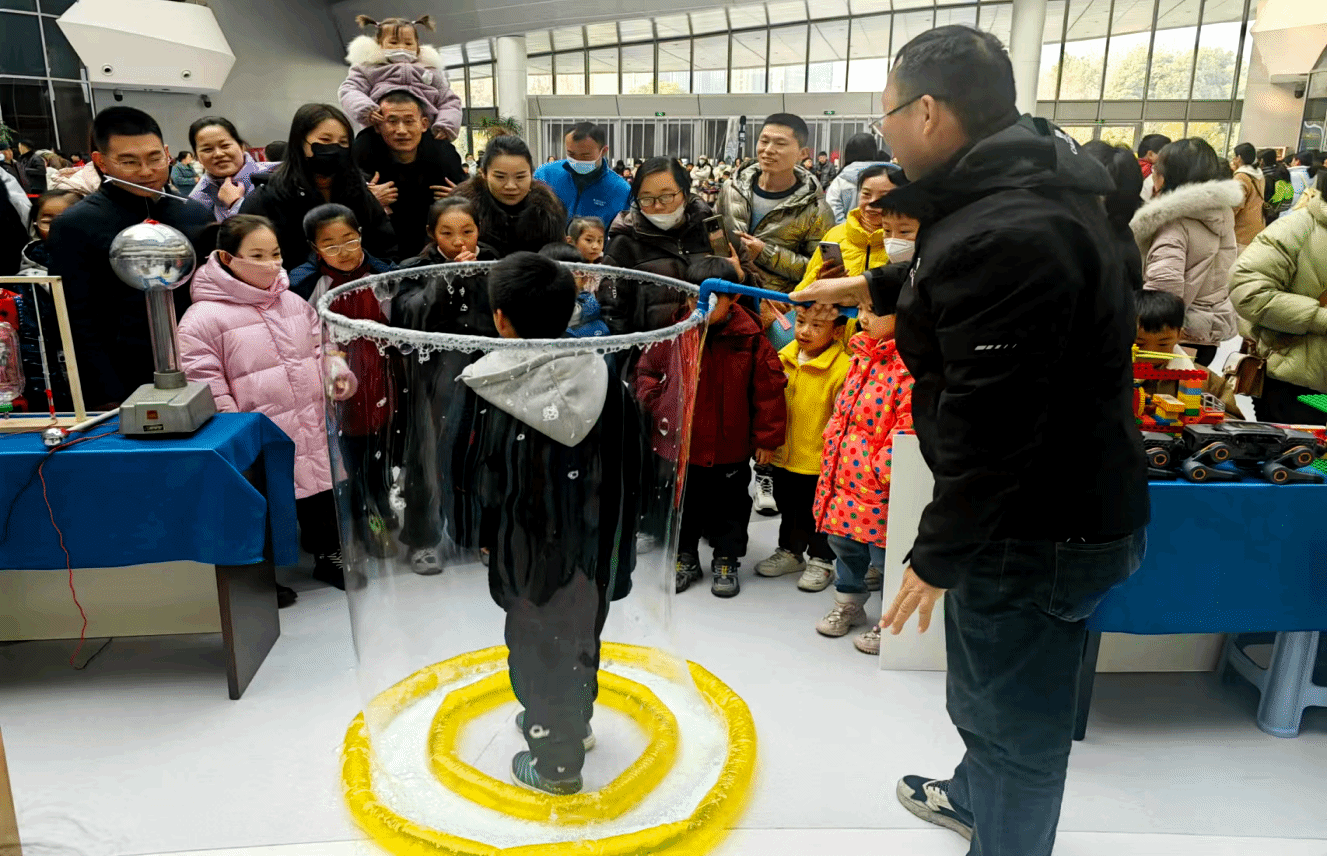 此外,该校师生还带来了多项趣味十足的实验互动项目,如“水龙戏珠”、“尖端放电”、“静电灯笼”、“套人泡泡”、“旋转气球圈”等。这些项目不仅趣味性强,而且科学原理清晰,吸引了众多学生和家长驻足观看、积极参与,激发了大家对科学的兴趣和热爱。