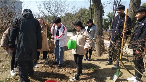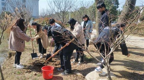 在植树现场,参加植树的师生个个热情洋溢、干劲十足,以饱满的热情投入到播种绿色的植树行动中。大家扛起树苗,来到指定种植区,挥动铁锹铲土、培土,用脚将土踩实;扶直樱花树苗、挥锹培土、浇水灌注。参加植树的人员相互协作,分工明确、有条不紊,整个劳动场面井然有序。
