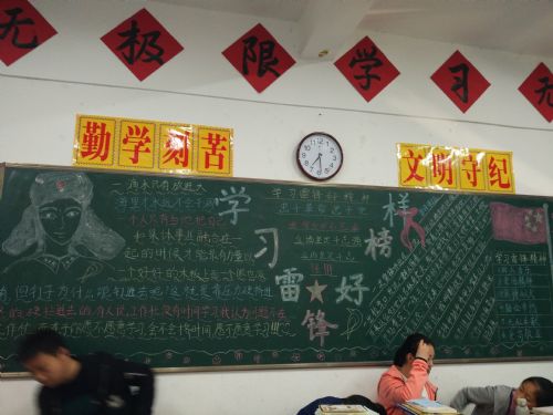 黑板报是宣传阵地之一,我班本次黑板报内容较为丰富,主要包括雷锋精神的介绍、雷锋图片、国旗、歌曲内容等,学生每天在教室的学习中,不由自主地会看到黑板报内容,受到潜移默化的影响,这也是一种教育。