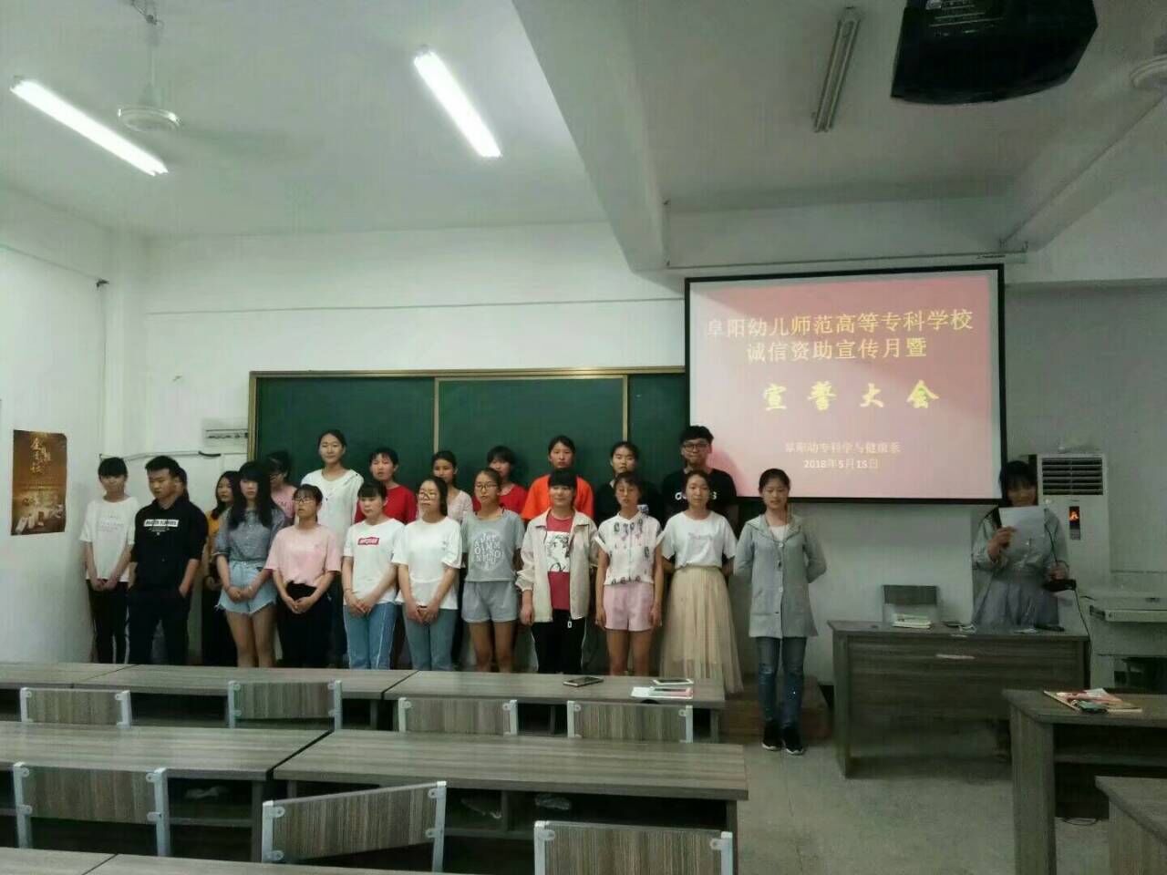 5月15日下午课外活动时间,我系在行知楼二楼南多媒体教室举行了“讲诚信,报党恩,诚信伴我健康成长”宣誓活动,我系受助学生代表在系学生会组织部吕宁宁同学的带领下,举行了庄严的宣誓活动。铿锵有力的话语、掷地有声的誓词、昂扬向上的斗志,都充分展现了我系学子诚实做人、诚信做事的决心。