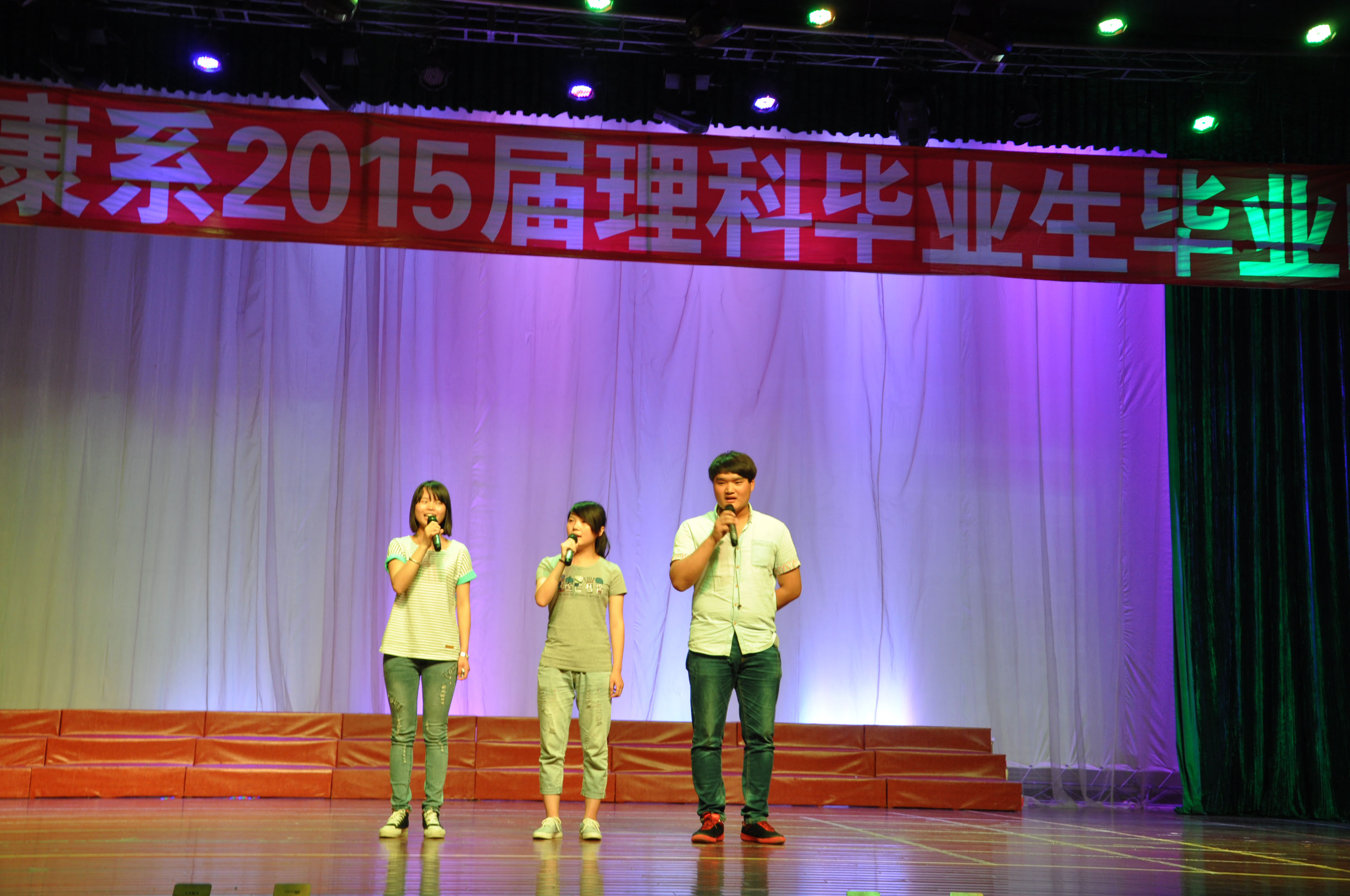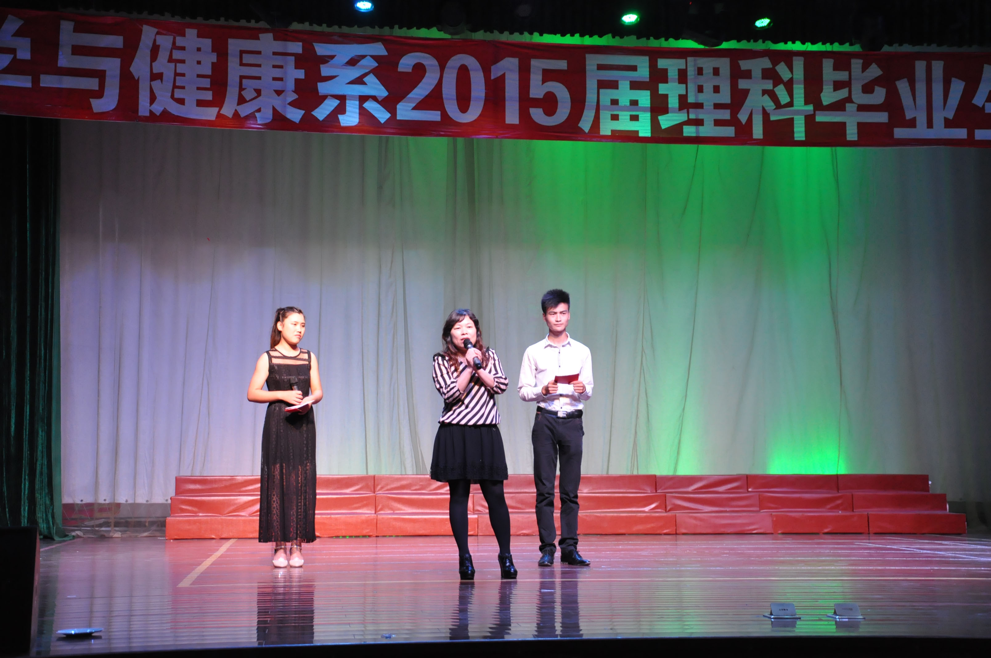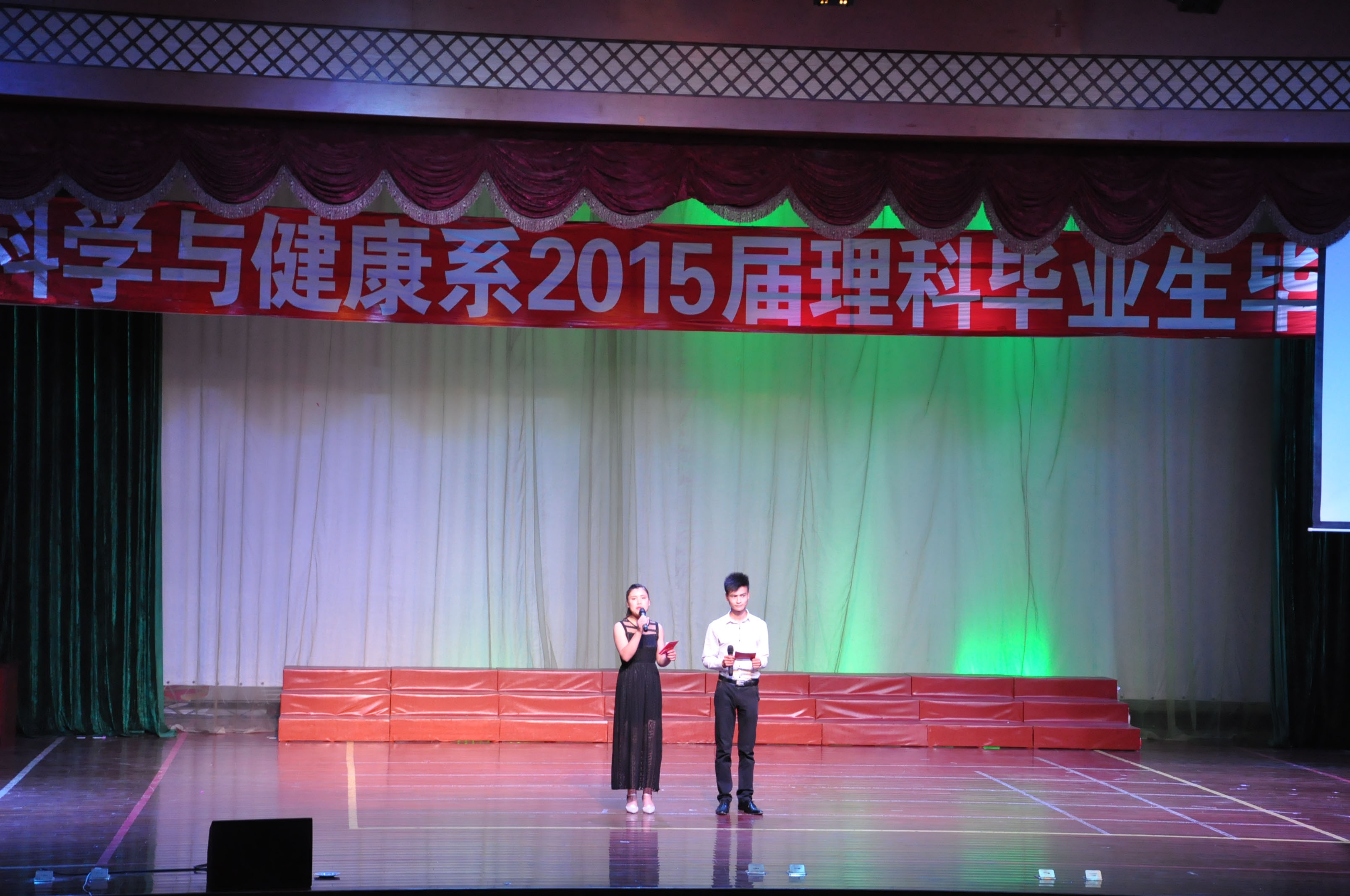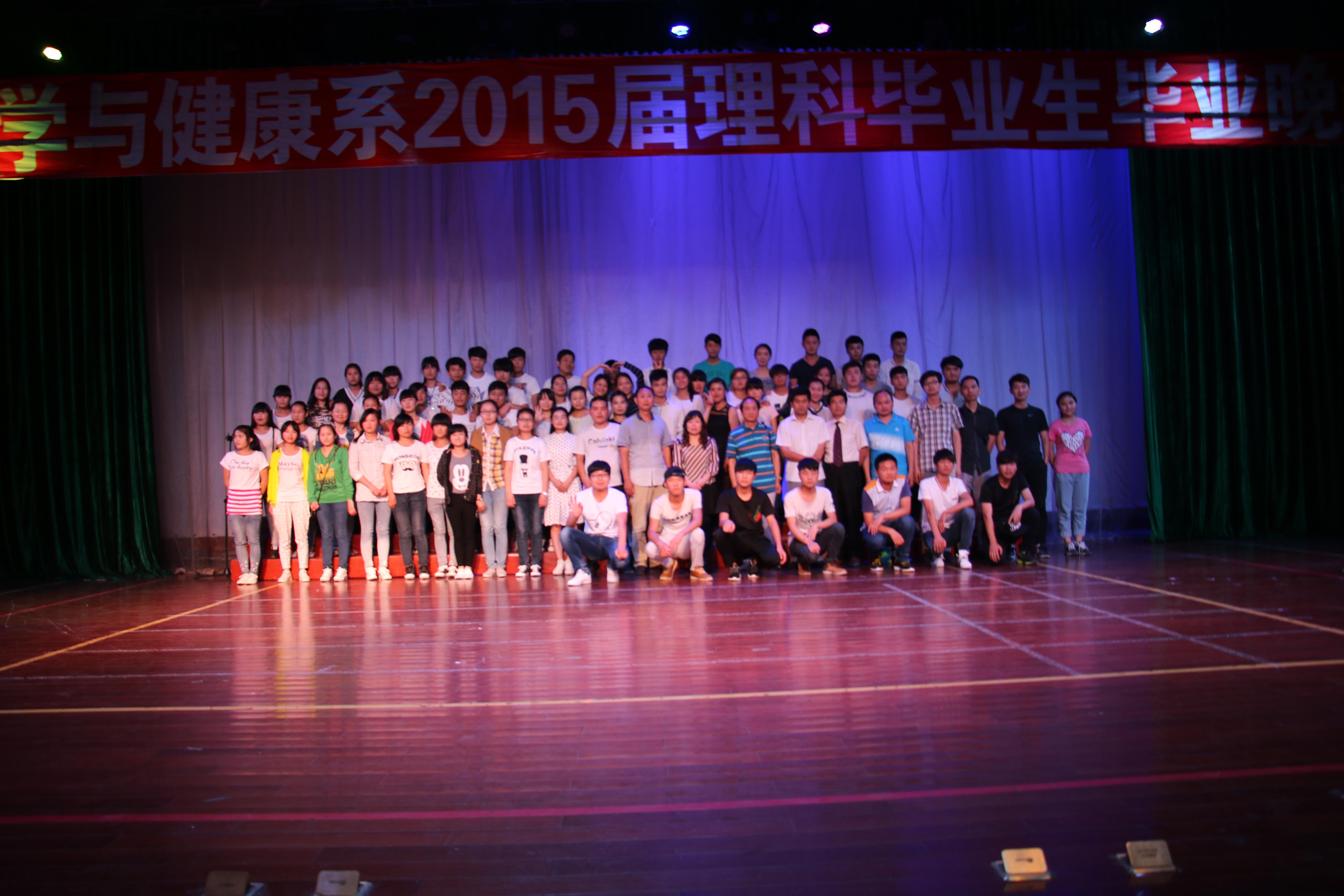 2015年6月3日晚18点整,科学与健康系2015届理科班毕业晚会在学校演播大厅正式拉开帷幕。在历时两个半小时的晚会中,由系老师、学生和毕业班学生为大家奉上了一场含有浓浓离别之情的欢送晚会。