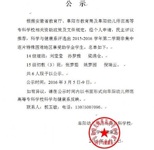 科学与健康系评选出2015-2016学年第二学期非集中连片特殊困难地区享受助学金学生