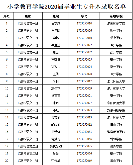 近日,2020年安徽省各高校专升本考试成绩及拟录取名单纷纷出炉,小学教育学院喜获佳绩,截至目前,我院报名考试的212名学生中,已有116名学生分别被阜阳师范大学、淮北师范大学、合肥师范学院、淮南师范学院、巢湖学院、滁州学院、黄山学院、亳州学院等高校录取,报录比高达55%,为学院历年最高,与同类高校相比,亦是名列前茅!捷报频传,全校师生欢欣鼓舞!