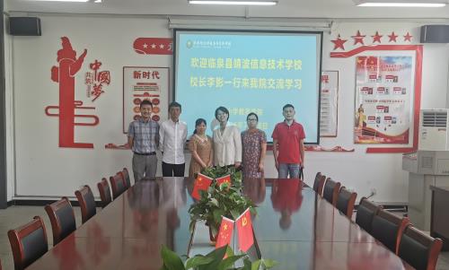 7月18日上午,临泉县靖波信息技术学校校长李影一行3人来我院交流学习。我院党总支书记、院长郭玉敏,副院长王敏锐等人接待了临泉县靖波信息技术学校领导一行。座谈会在文津楼201召开,由郭玉敏主持。