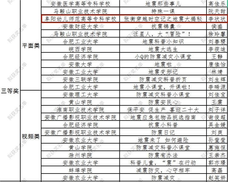 据悉,在本项赛事中,我省本专科学生同台竞技,经过激烈角逐,我院许安同学作品《防震知识竞赛》荣获省赛等奖,赵永钦同学作品《地震预警如何实现荣获省赛等奖,李状状同学作品《张衡穿越时空记之地震大揭秘》荣获省赛三等奖。