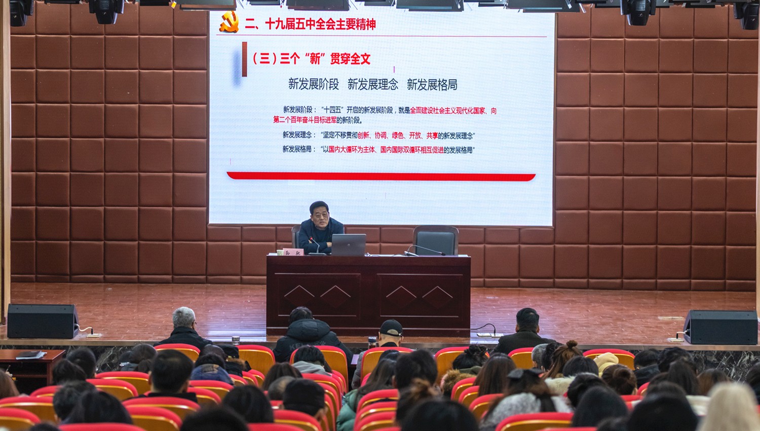 孙驰从十九届五中全会基本情况、十九届五中全会主要精神、全面掀起学习宣传五中全会精神热潮、扎实做好“十四五”时期学校各项工作等四个方面开讲,阐述了十九届五中全会的重要历史意义,重点介绍了我国决胜全面建成小康社会取得的重大成就和制度优势,详细解读了十四五时期经济社会发展和改革开放的重点任务。并紧密结合学校实际,描绘了学校十四五的发展目标和美好前景,对在座的师生提出了殷切的希望,要求大家准确把握全会以推动高质量发展为主题和对教育事业发展作出的重大部署,全面系统地抓好习近平总书记重要讲话和全会精神的学习宣传工作。