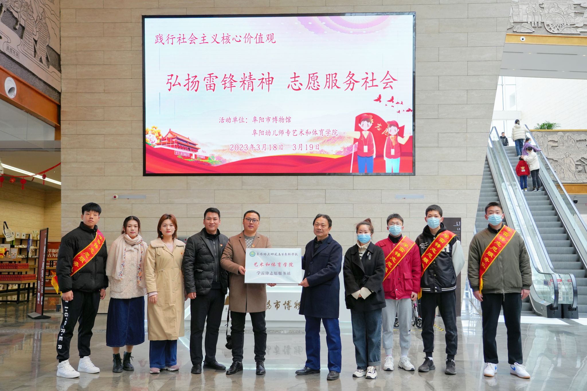 为学习贯彻落实习近平总书记重要指示精神,进一步传承和弘扬雷锋精神,推动学雷锋志愿服务制度化常态化长效化,结合我院专业优势,厚植青年学子热爱奉献意志,全面推进立德树人工作任务。3月18日上午,艺术和体育学院团总支组织“学雷锋”志愿服务队到阜阳市博物馆开展志愿服务活动,活动期间举行了授牌仪式,阜阳市博物馆副馆长杨玉彬亲自接待,艺术和体育学院党总支负责人范云峰、团总支书记周振国、教学秘书张希以及带队老师和14名志愿者参加。