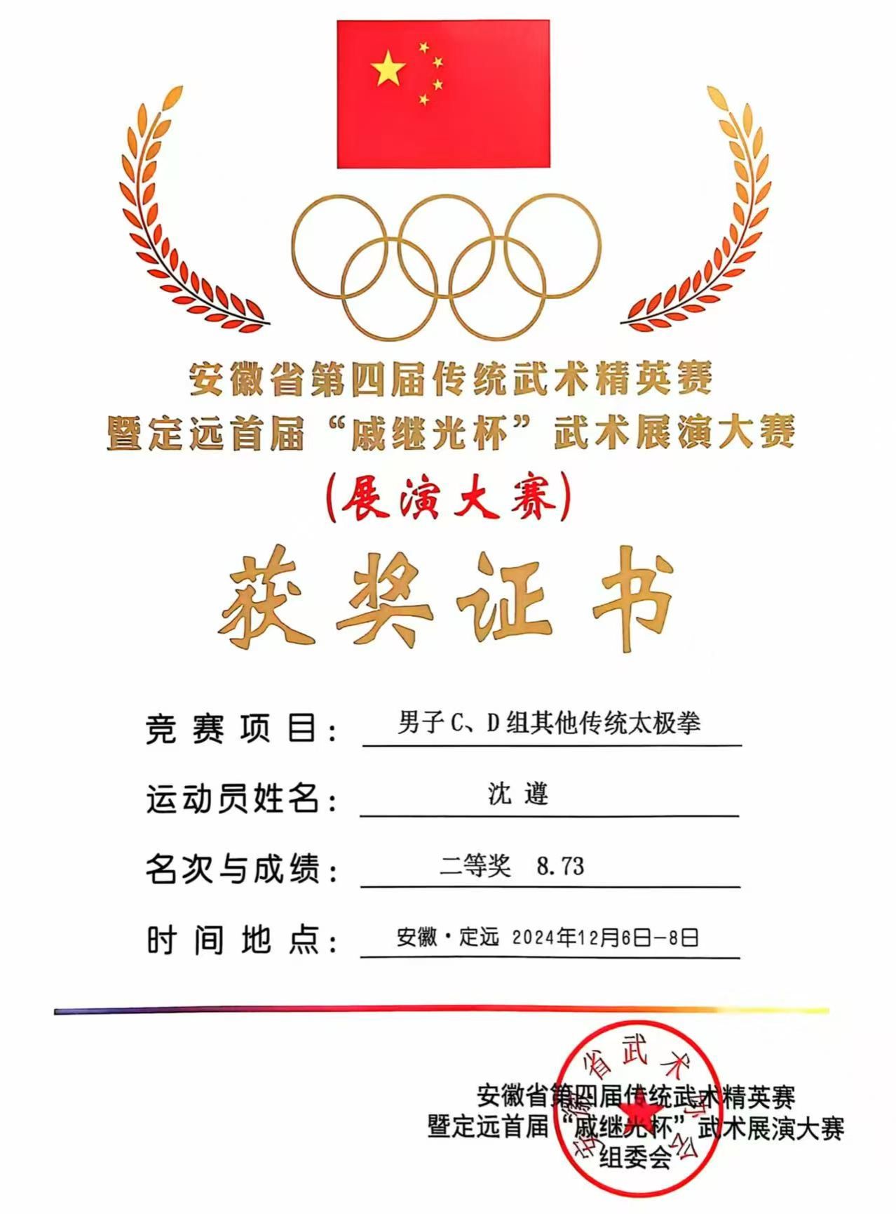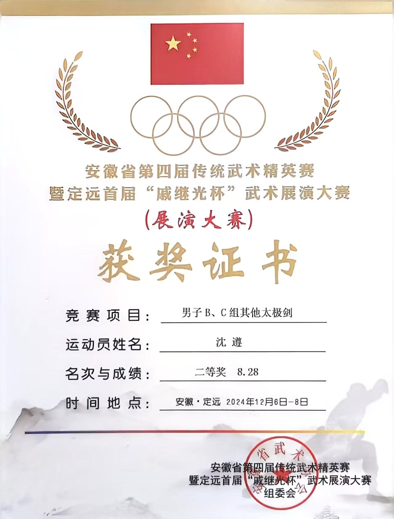 此次大赛吸引了来自全省16个地级市的1300余名运动员参与竞争。我校派出的2名优秀运动员王家兴和沈遵,在安徽省第四届传统武术精英赛暨定远首届“戚继光杯”武术展演大赛中,凭借精湛的技艺和出色的发挥,最终取得了令人瞩目的佳绩。
