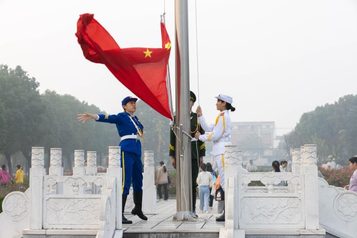 鲜红的五星红旗伴随着《义勇军进行曲》缓缓升起,秋日的朝阳燃遍整个天空,学院全体师生肃立注目,让人心怀无限憧憬与向往。