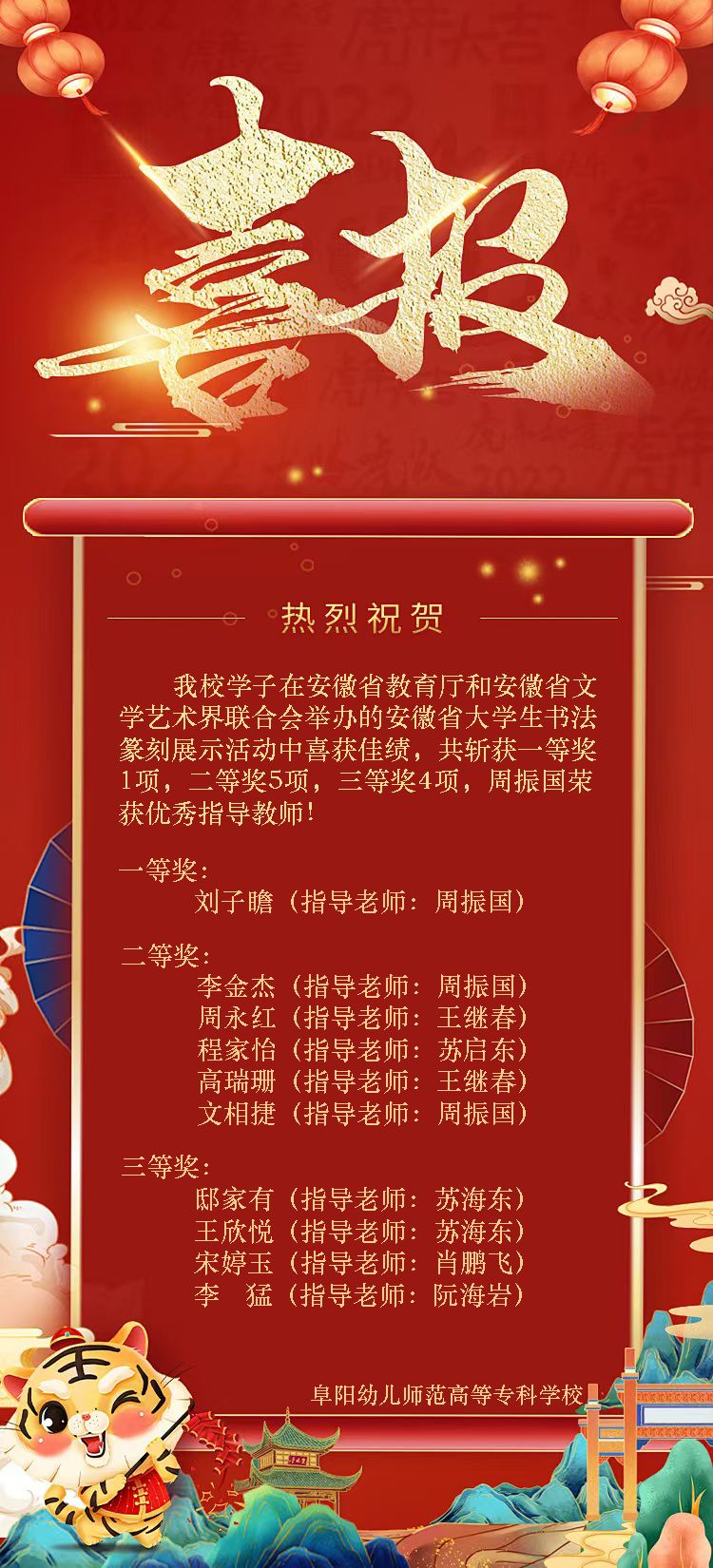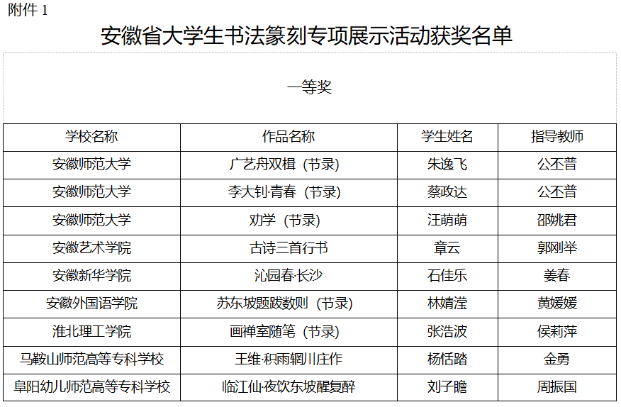 近日,由安徽省教育厅与安徽省文学艺术联合会主办、安徽省书法家协会与安徽师范大学承办的安徽省大学生书法篆刻展示活动圆满落幕。本次比赛是安徽省大学生科学和技能竞赛B类赛事项目,我校学子在此次展示活动中表现优异,共斩获一等奖1项,二等奖5项,三等奖4项上报作品全部获奖