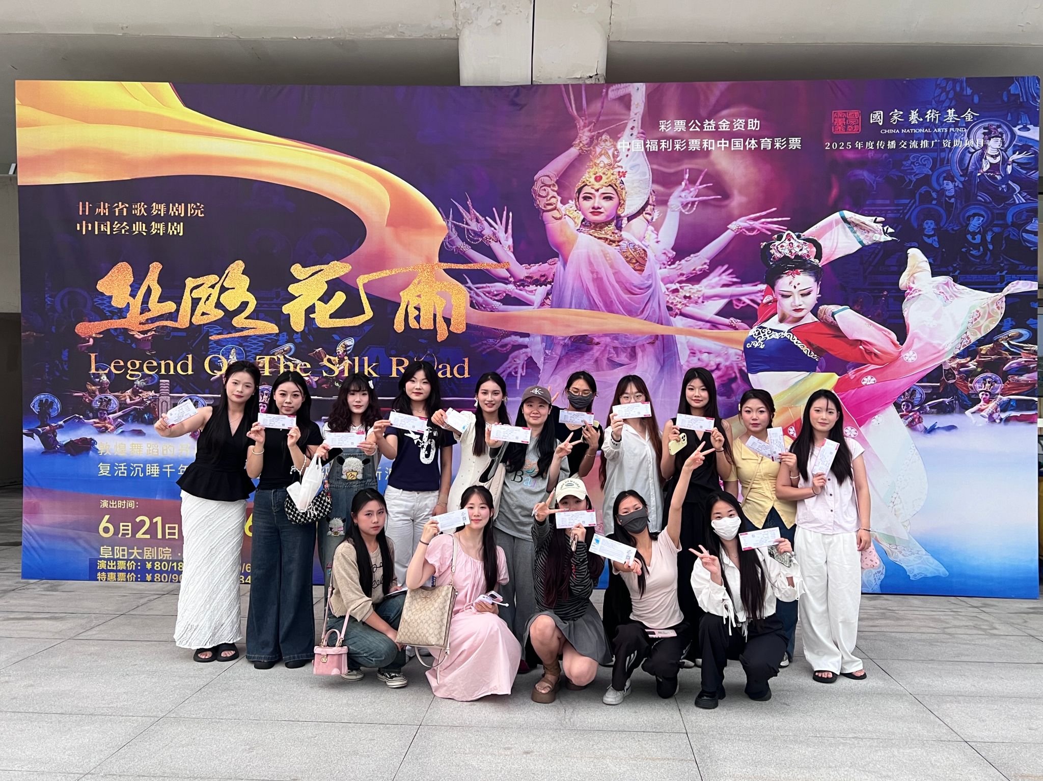 为深化校企合作育人实效,践行 “我为同学做实事” 服务理念6 月 21 日晚,我校舞蹈表演专业 50 余名师生赴阜阳大剧院观看国家艺术基金优秀剧目展演舞剧《丝路花雨》,在敦煌舞姿中感受中华优秀传统文化魅力。