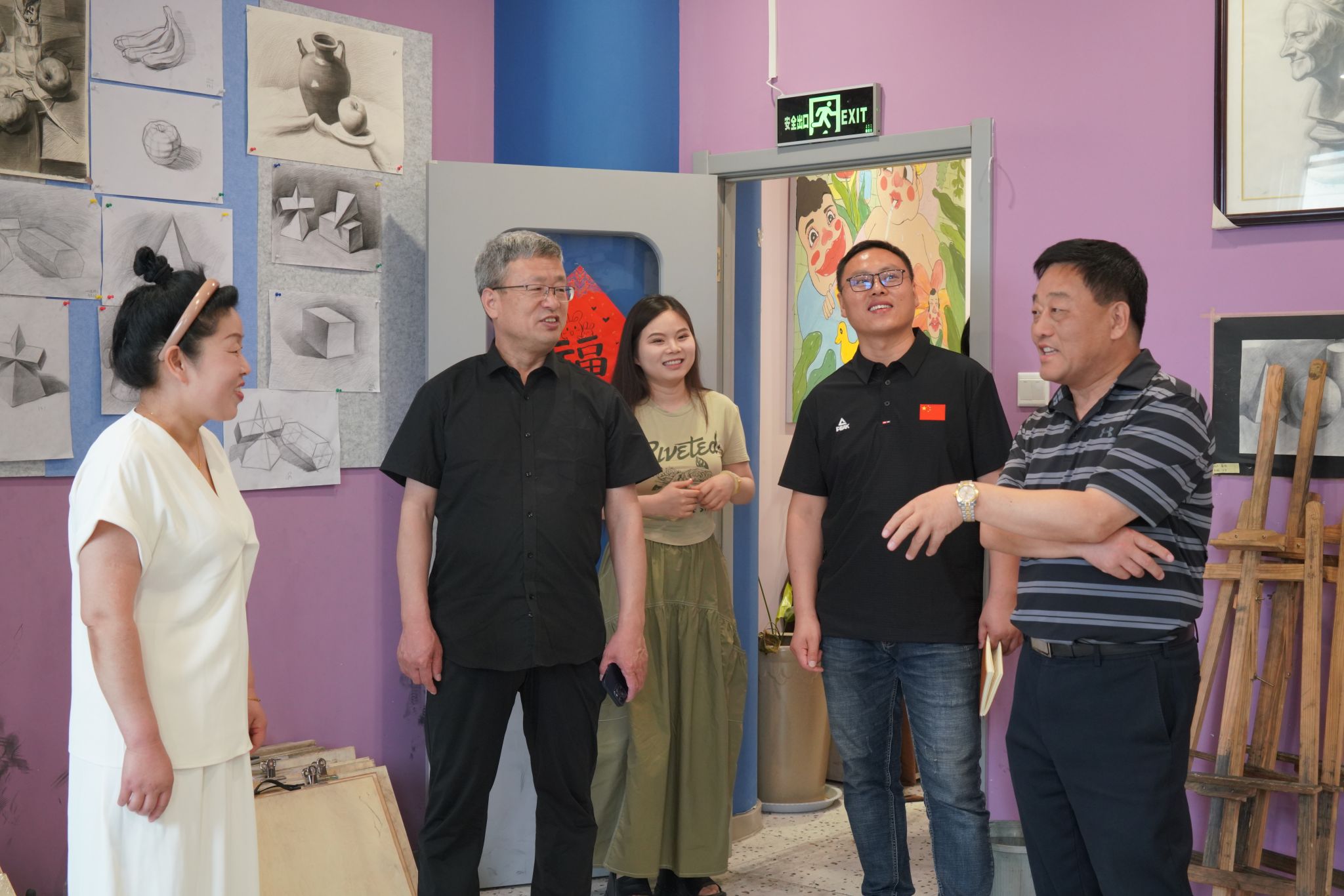 访企后,看望了2019届优秀毕业生慕宇,了解了近期发展情况,参观了家族企业画童少儿画室,根据介绍,慕宇自毕业后考上教师编制,帮助家人提升画室办学规模、制定企业目标、规范企业管理、创办品牌,成为当地知名少儿培训企业。孙驰对校友,敢闯敢干的精神给予肯定,并对画室的环境创设和办学规模给出高度评价,并热情邀请校友返校交流,为学弟学妹传经送宝,同时也希望慕宇能够坚守教育初心,做好本职工作的同时,多为社会做贡献,给母校争光。