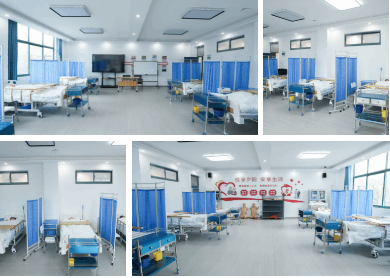 配有高级护理床、高级全功能护理人模型、电子心肺复苏模拟人等设备,满足老年人基础照护与急救技能训练。