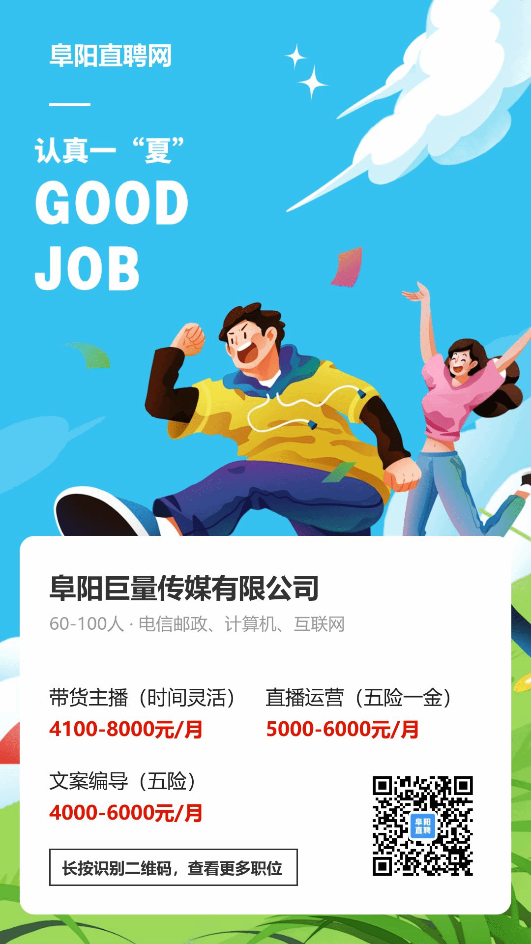 阜阳巨量传媒有限公司招聘主播和运营人员,福利待遇都很好,有兴趣的请联系,李女士19159868586
