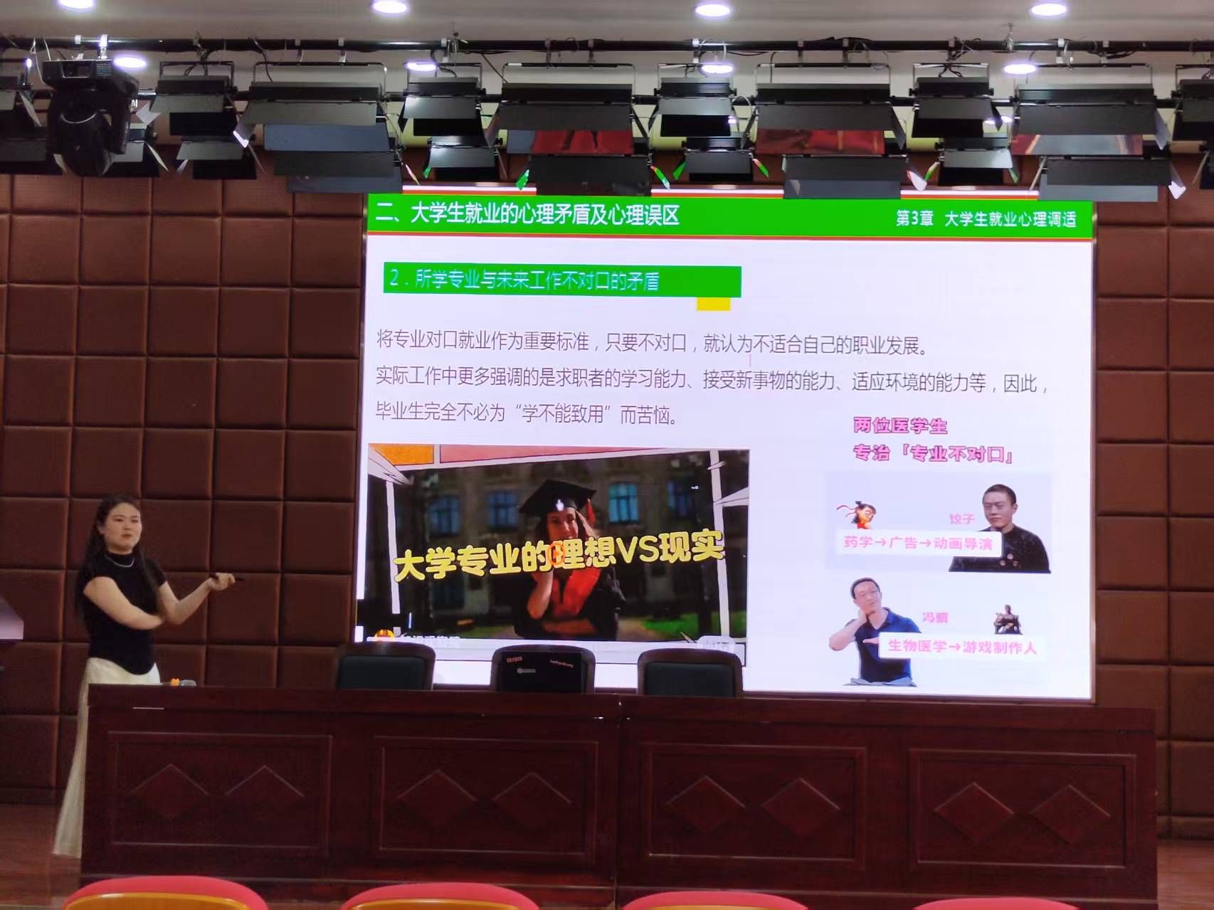 2025 年 5 月 7 日下午,学校在大学生一站式社区学术报告厅举办名师沙龙大学生就业指导系列讲座第三期,主题为 “大学生就业心理调适”,主讲人杨梦洁。
