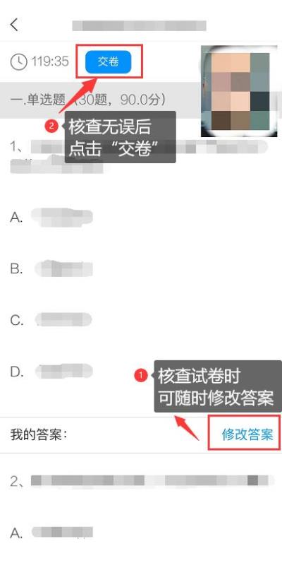 5.核查作答情况时,可修改选择答案;确认无误后,点击最上方的“交卷”按钮,并确认提交。(若存在未作答题目,系统会提示,请注意核查!)