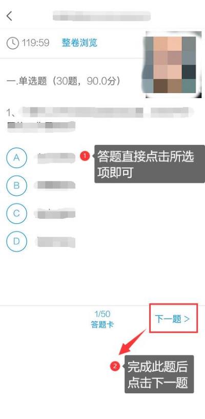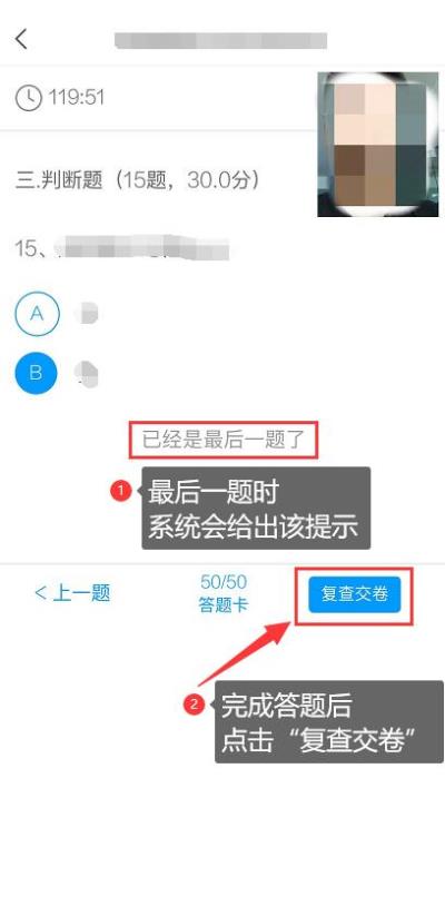 4.开始答题并交卷:每题选择正确答案点击该选项即可,点击右下角“下一题”继续作答;到最后一题时系统会提示“已经是最后一题了”,可点击“复查交卷”进行答题情况核查。