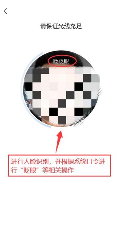 3.进行人脸识别,并根据系统口令进行“眨眼”等动作,识别成功后点击“确认”;(注意:请保证识别时光线充足)