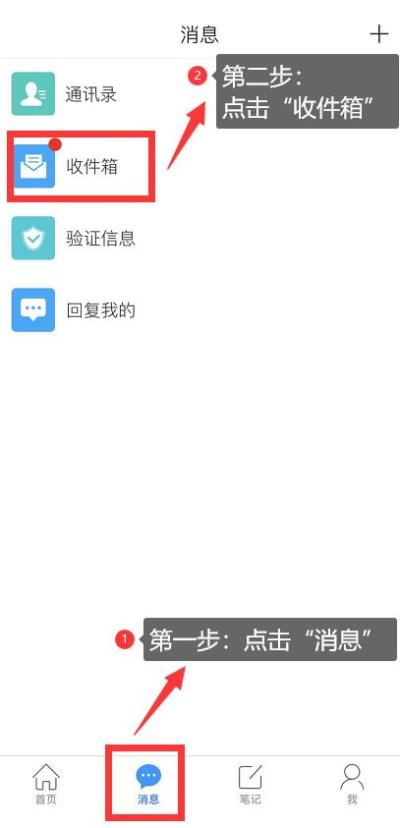 1.点击最下方“消息”,后点击“收件箱”;找到“考试通知”,点击进入;