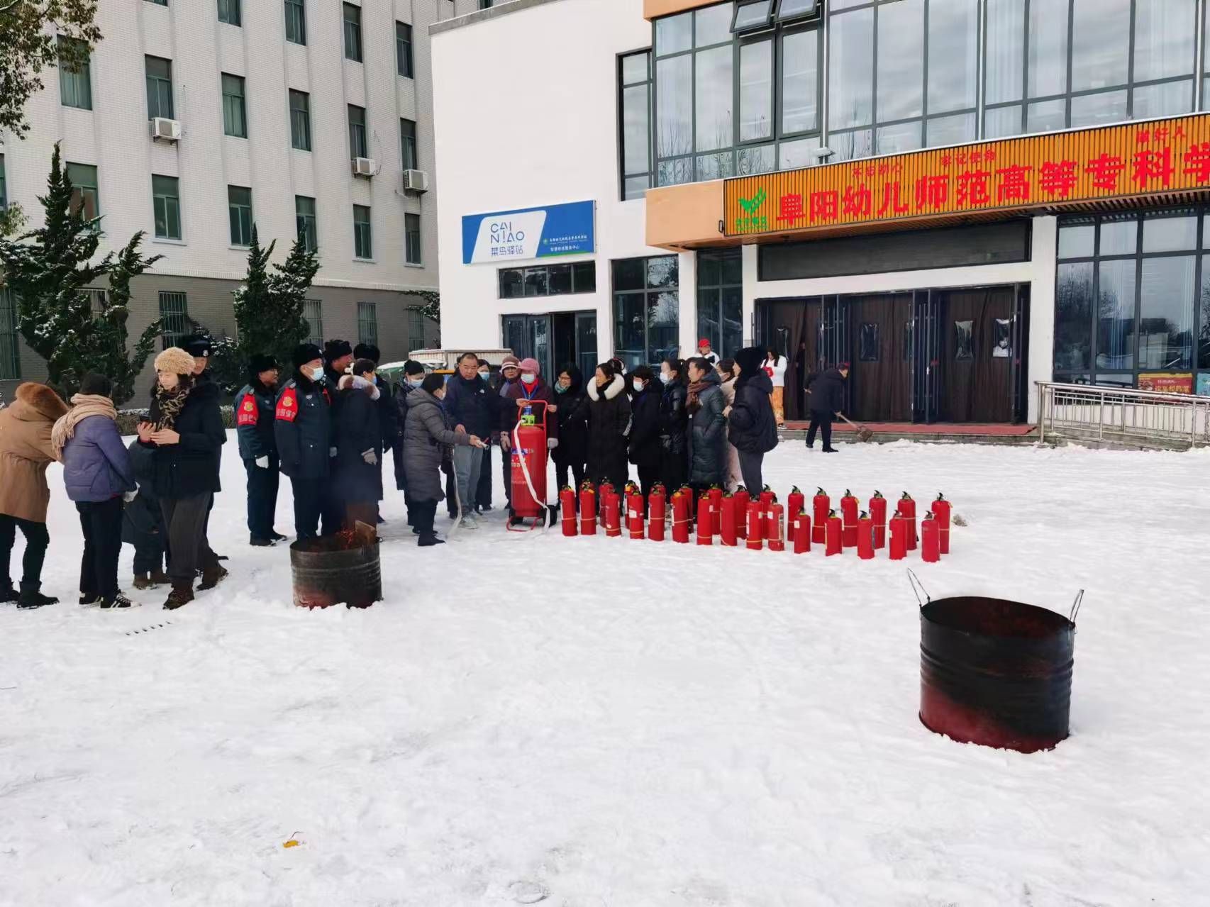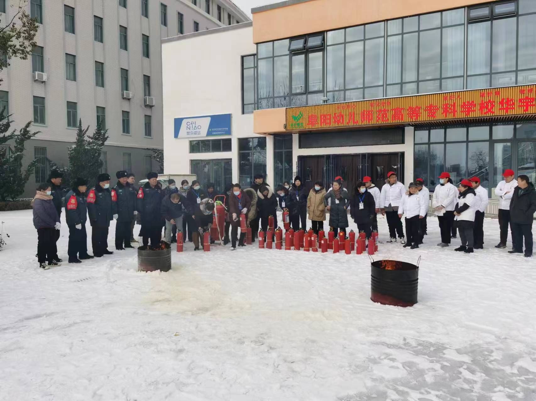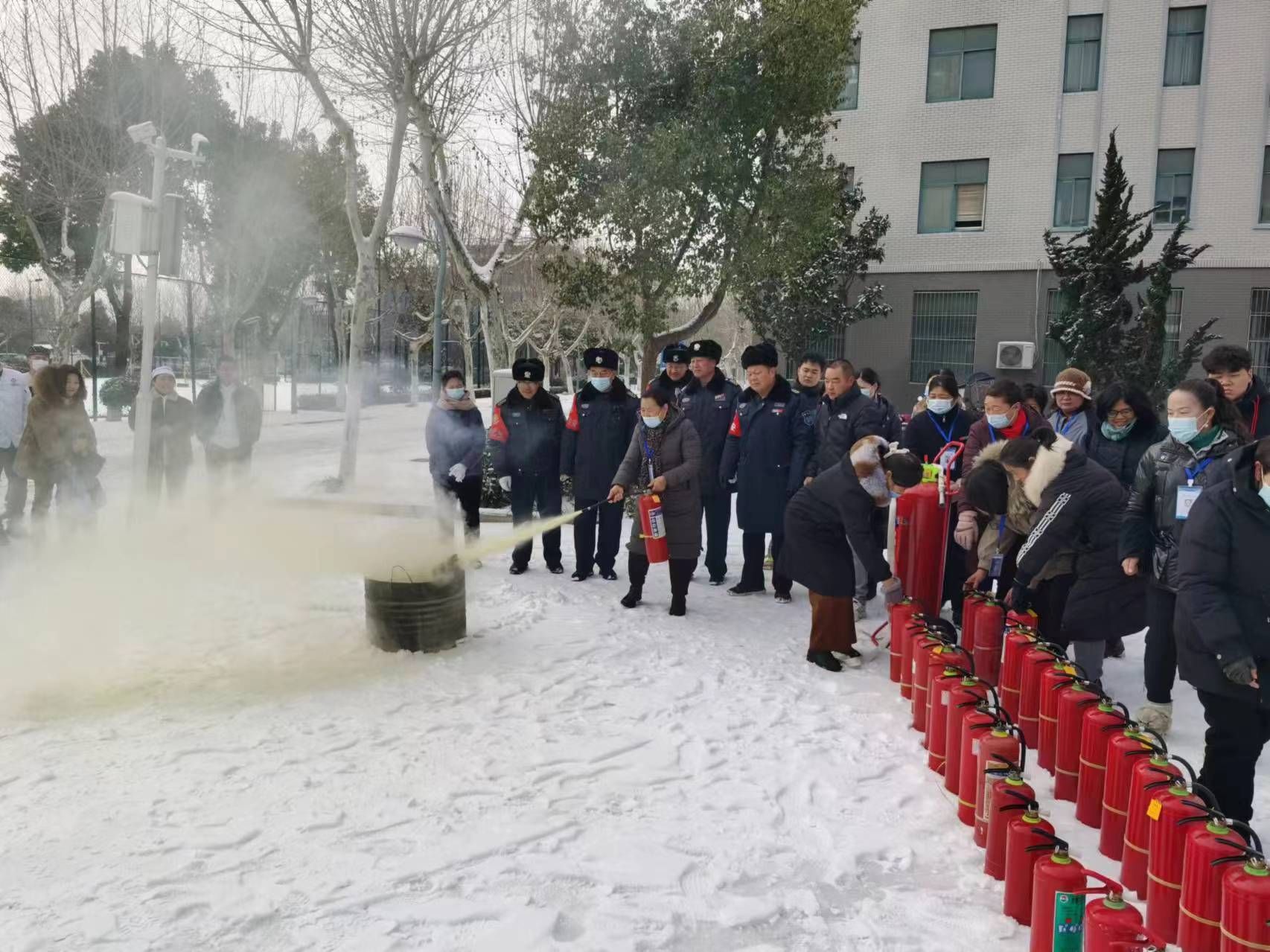 演练中,总务处(保卫处)张强同志紧贴学校宿舍、食堂、浴池等重点区域实际,从火灾原因分析、防灭火基本常识、干粉灭火器的种类及使用操作方法等四个方面进行了讲解示范,促使演训人员进一步熟悉灭火装备操作使用和防火灭火的处置流程。在消防安全员的具体指导下,演训人员克服冰雪恶劣天气影响,逐一进行实操演练,针对个别人员操作使用灭火器材动作不规范现象,消防安全员现场进行纠正和再讲解,整个过程组织严密,人员积极踊跃,演练全程正规有序,达到了预期效果。