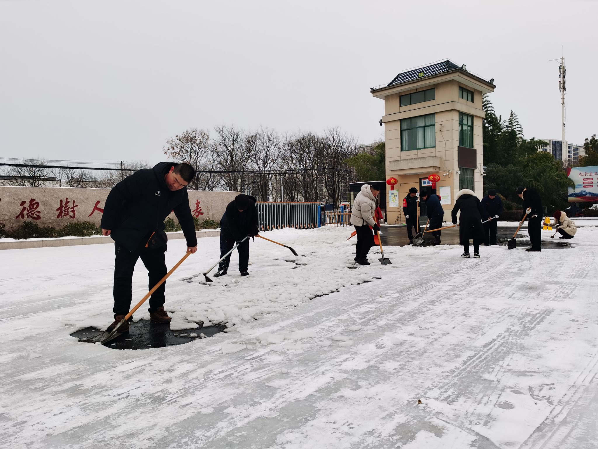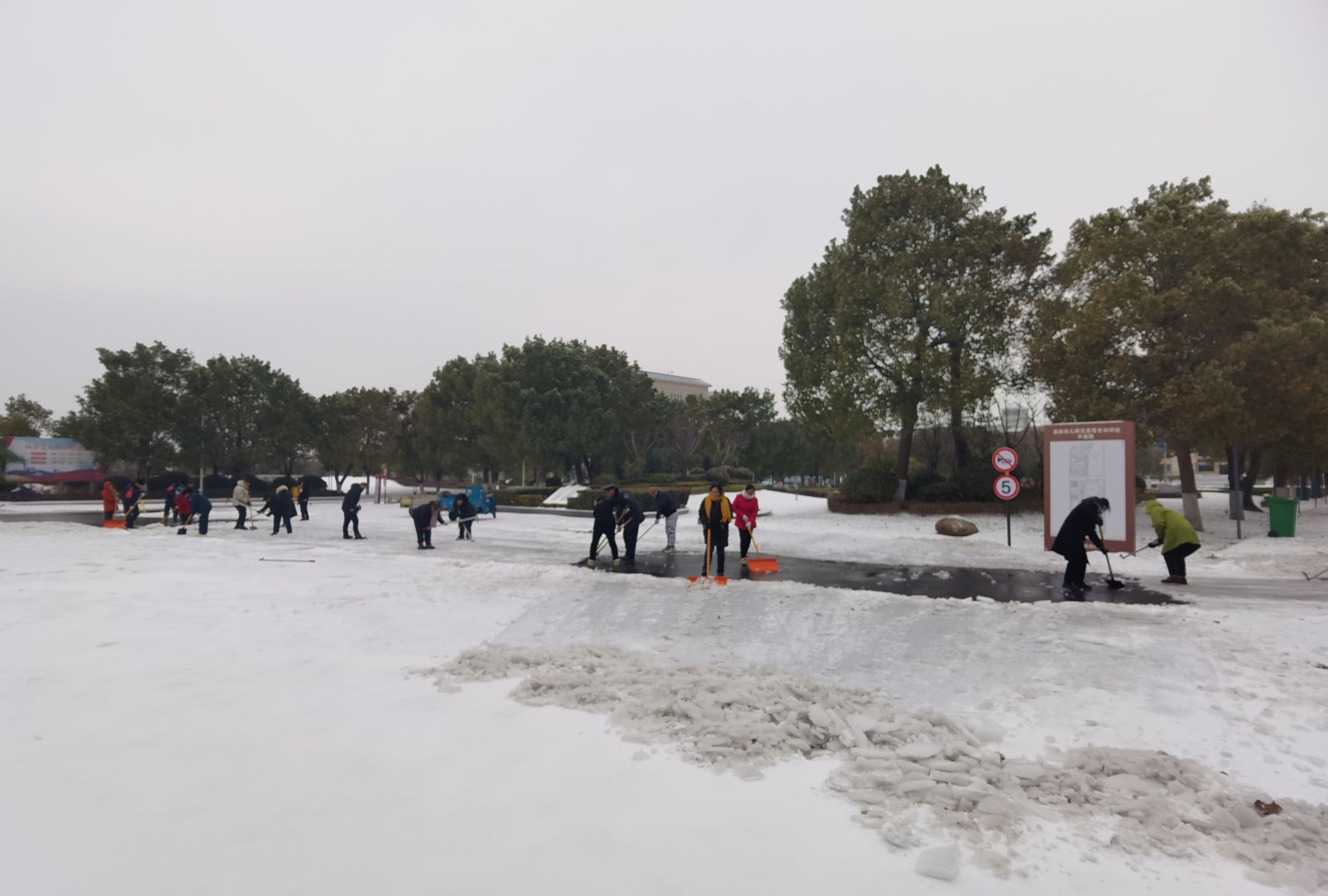 目前,在大家的齐心协力下,整个校园已贯通出一条从南到北的通行路面,其余积雪也在陆续清理中。